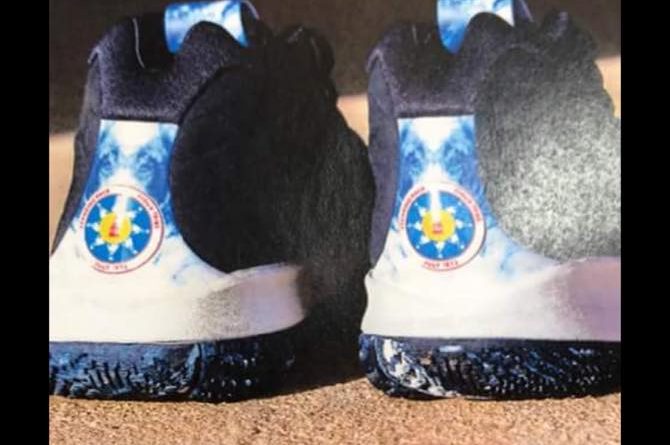 雖然暫時只有背影,但可以清晰見到鞋跟有一個屬於 Standing Rock 印章,根據影相人指出依對鞋屬於 Standing Rock Sioux 部落一位朋友,今年 Kyrie 4 ”N7” 將以 Standing Rock 作為設計概念。